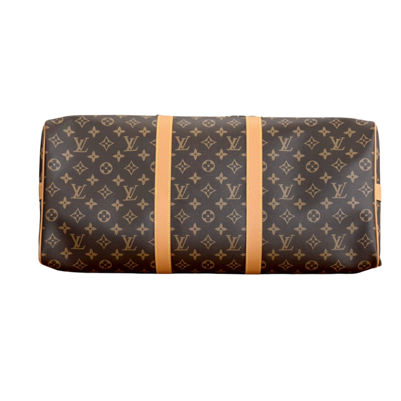 Body: Monogram coated canvas (iconic LV monogram pattern, durable and water-resistant) Trim: Natural cowhide leather (Vachetta or colored leather like Coquelicot red, develops a natural patina over time) Lining: Textile lining Hardware: Gold-tone metal hardware (including padlock) Standard size 50, spacious capacity, perfect for 2-4 day trips, suitable as carry-on luggage.