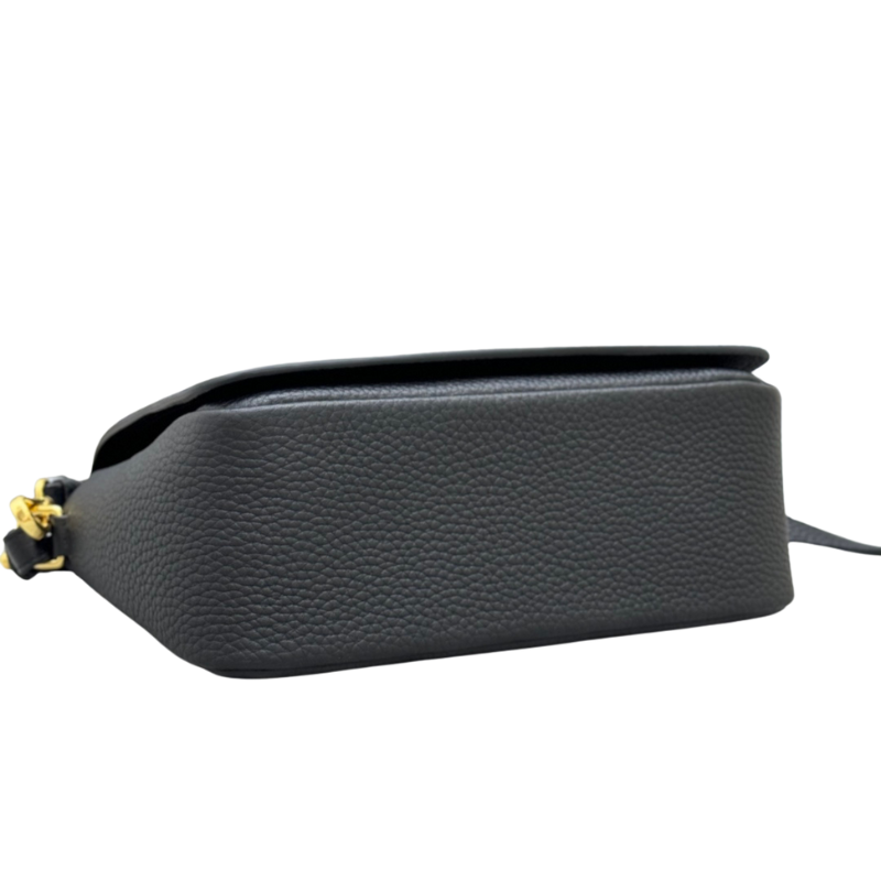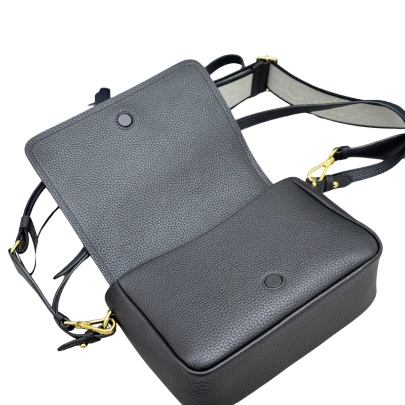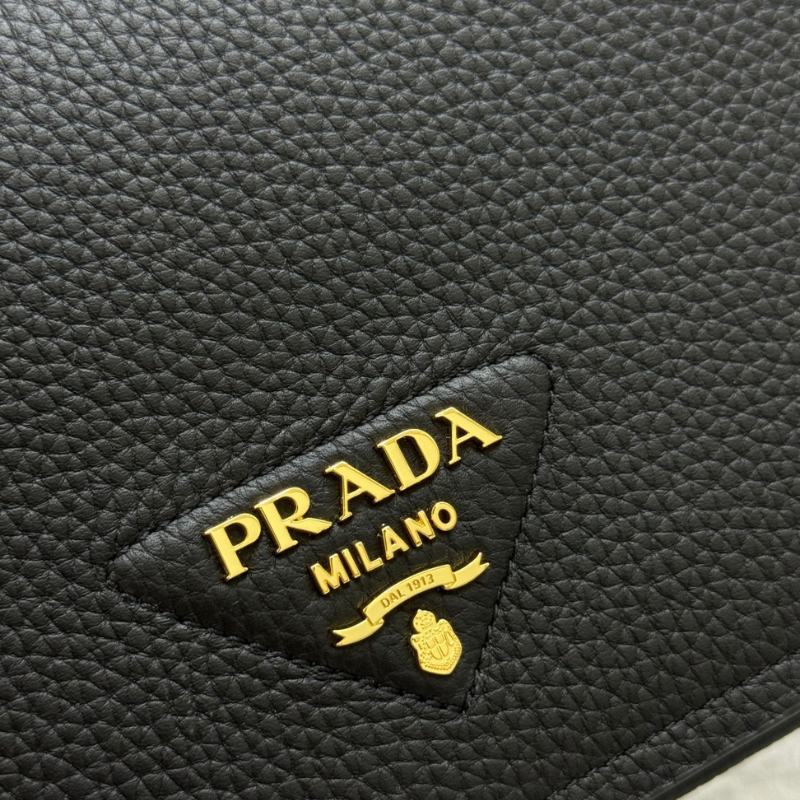Leather Shoulder Bag (Gold Buckle Double Strap Leather Shoulder Bag), Prada’s recent popular new release, crafted from soft grained calf leather (Calf Leather or Daino Leather). Featuring a modern and practical design, it comes with two detachable shoulder straps: One classic adjustable leather shoulder strap + one logo-embroidered woven tape strap, enabling versatile carrying options (shoulder or crossbody). Gold-tone hardware (including magnetic “gold buckle” closure and logo lettering) adds sophisticated shine. The black version (Nero) offers understated luxury and exceptional versatility, making it one of the must-have pieces for the 2025-2026 season.