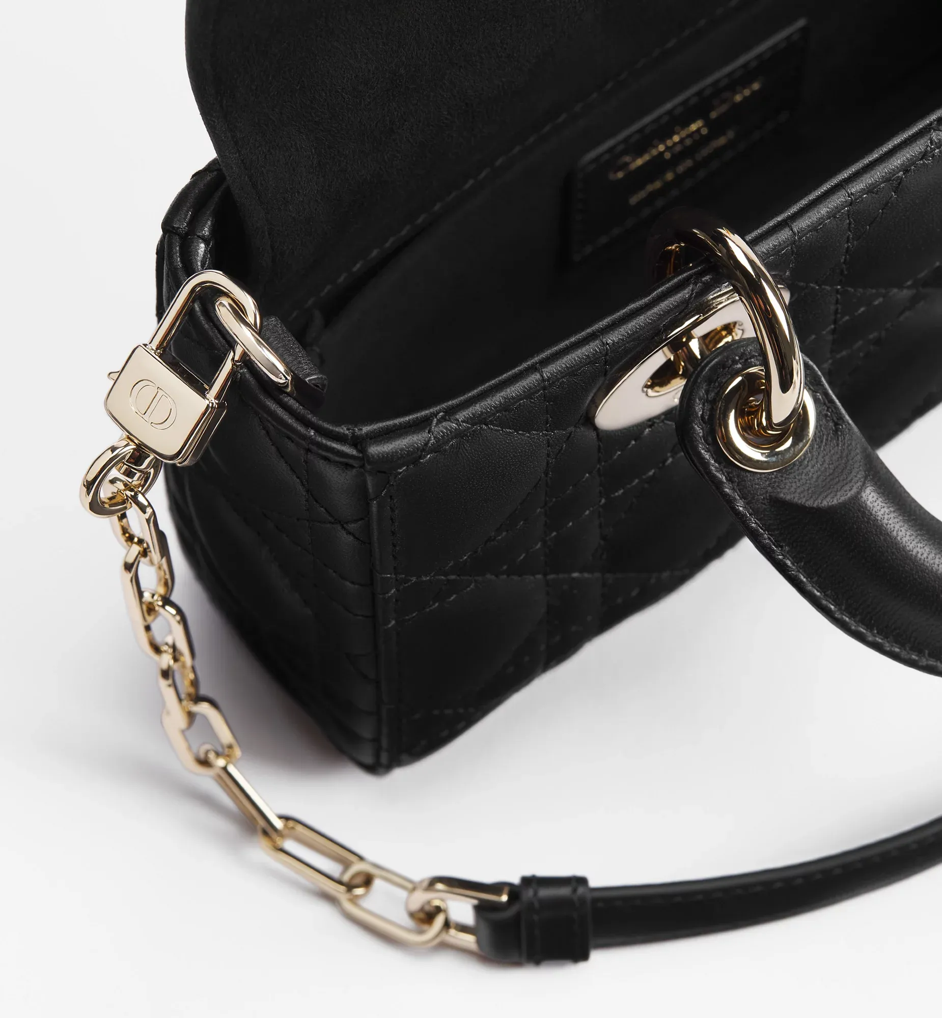 The Lady D-Joy handbag embodies the minimalist aesthetic of the Lady Dior collection, crystallizing Dior’s profound vision of elegance and beauty. Crafted from black sheepskin leather, it features a cannage-patterned satin stitching and a light gold-tone metal D.I.O.R. charm, accented by a removable leather bow for added sophistication. The mini size, complete with a detachable chain strap and an adjustable, removable leather shoulder strap, can be carried by hand, worn over the shoulder, or slung crossbody, making it the perfect companion for everyday looks.