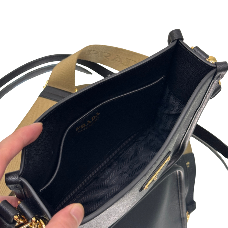 ,可舒适地手提或肩背。内部衬有Prada徽标印花Re-Nylon面料,设有两个口袋(其中一个带拉链)。金属配件(金色或银色,视批次而定)。