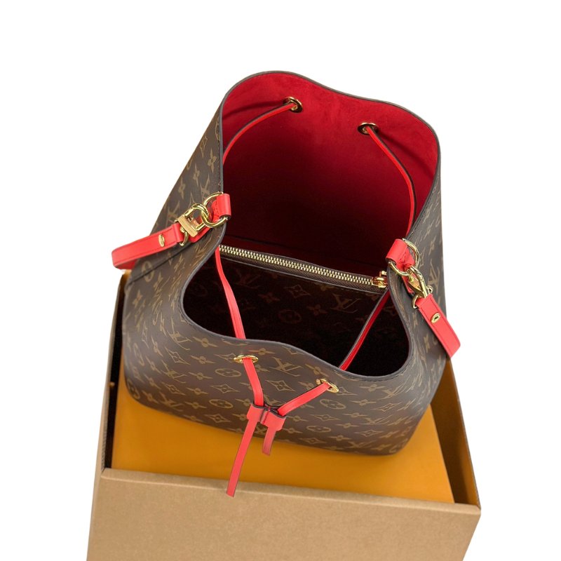 This NéoNoé MM bucket bag is a reinterpretation of Louis Vuitton’s iconic 1932 Noé design. Crafted in classic Monogram canvas with clean, fluid lines, it features vibrant calf leather trim (Coquelicot poppy red/crimson in this style) and a matching lining. Lightweight and practical, it’s perfect for everyday carry or crossbody wear.