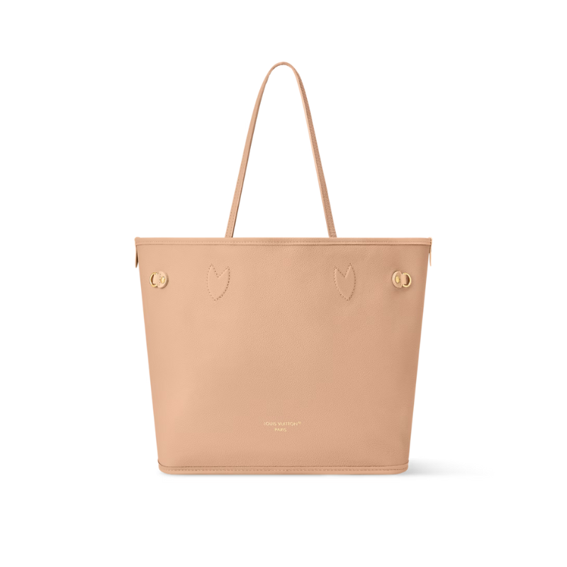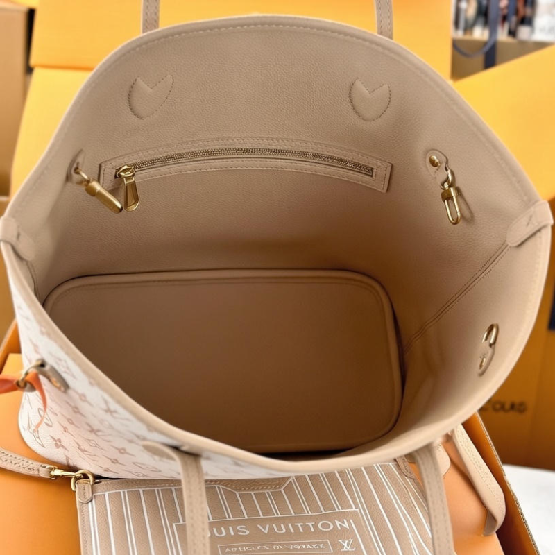 Design Inspiration: An innovative reversible take on the iconic Neverfull, featuring one side in signature Monogram canvas and the other in elegant grained calfskin (typically in beige/smoky gray or neutral tones). The dual-sided design offers two distinct styles, practical spaciousness, and versatility for daily use, commuting, or travel—blending classic heritage with modern functionality.