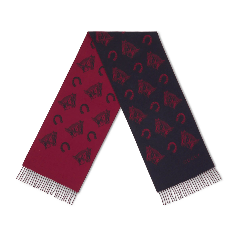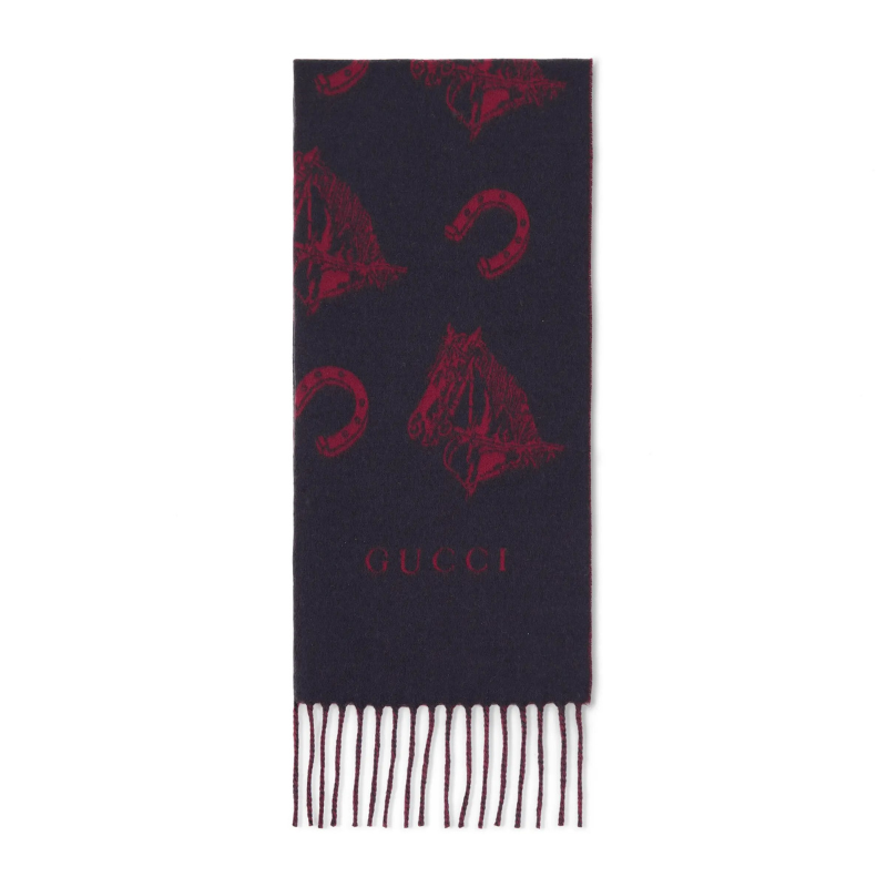 The brand’s silk accessory collection stays true to its heritage, reinterpreting iconic motifs like GG, webbing, Flora, bamboo, horsebit, and equestrian elements through luxurious materials, masterful craftsmanship, and fresh color palettes. Crafted from a silk-wool blend jacquard fabric in an equestrian motif, this scarf features meticulously integrated fringe trim that enhances the design’s fullness.