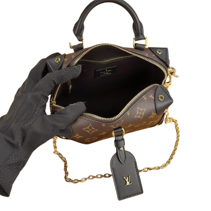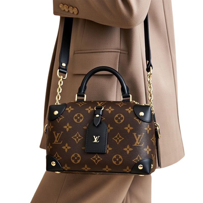 Design Inspiration: Drawing from the brand’s heritage of crafting iconic luggage, this soft version of the Petite Malle blends vintage trunk elements with contemporary softness. Riveted leather corners and luggage tag details pay homage to traditional trunks, offering lightweight flexibility while retaining structured form. Body: Monogram coated canvas (iconic LV monogram pattern, durable and water-resistant) Trim: Cowhide leather (riveted reinforced corners, luggage tag) Lining: Textile lining Hardware: Gold-tone metal hardware (including gold-tone marine chain)
