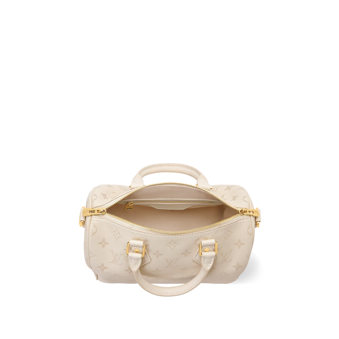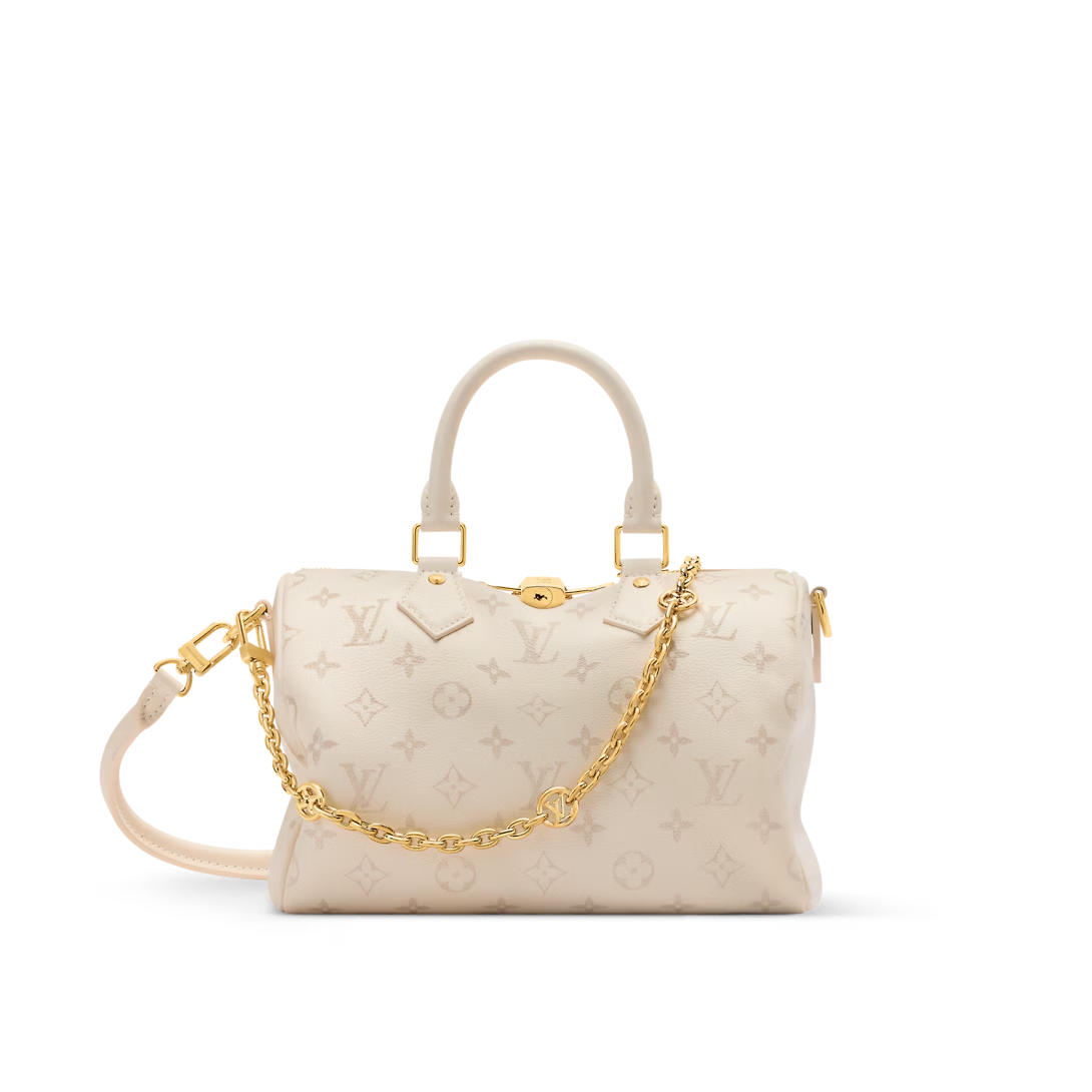 Speedy Bandoulière 25 手袋是路易威登的标志性款式。图中所示版本似乎是一款采用柔软小牛皮或 Monogram 涂层帆布(例如 M26690 或类似型号)制成的新款,其特色在于现代感十足的“乳白色”。