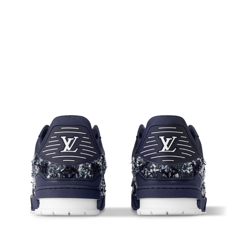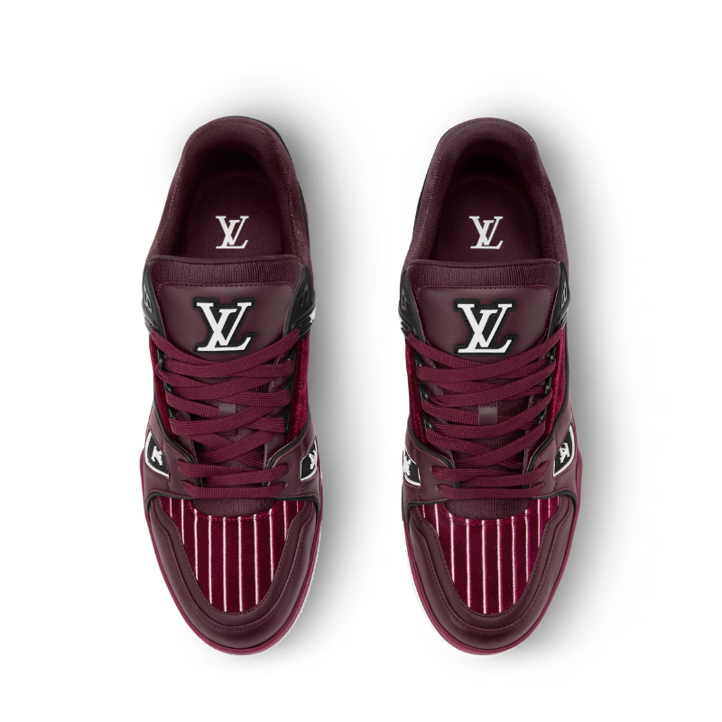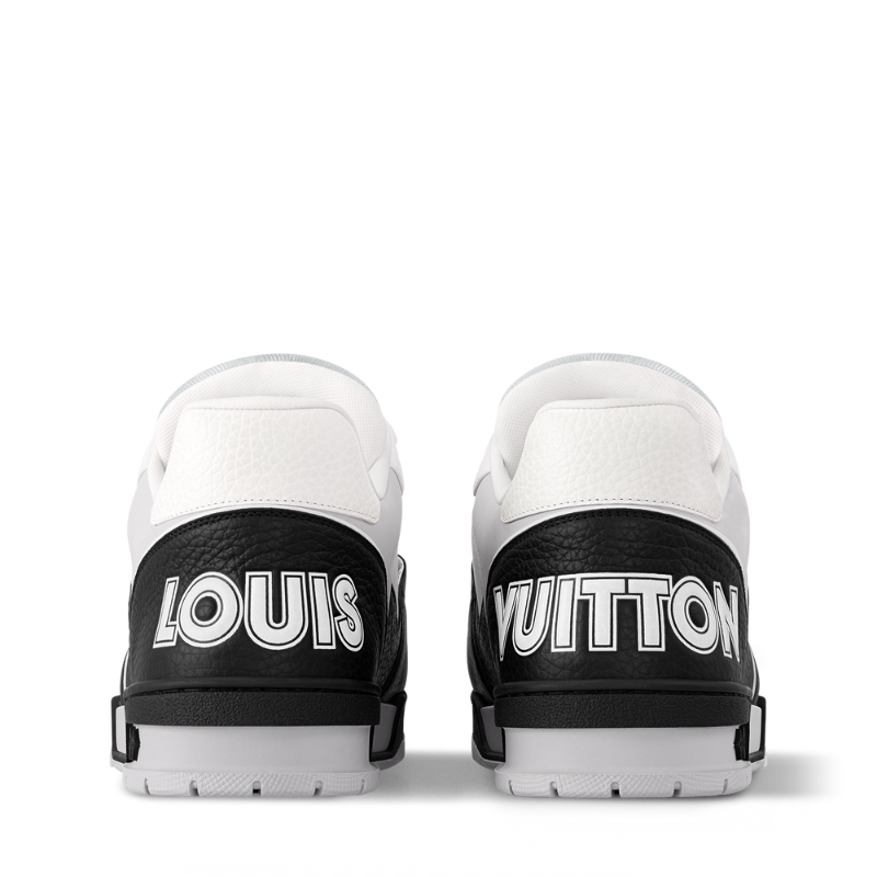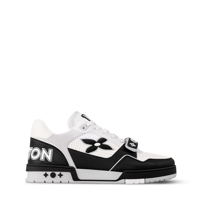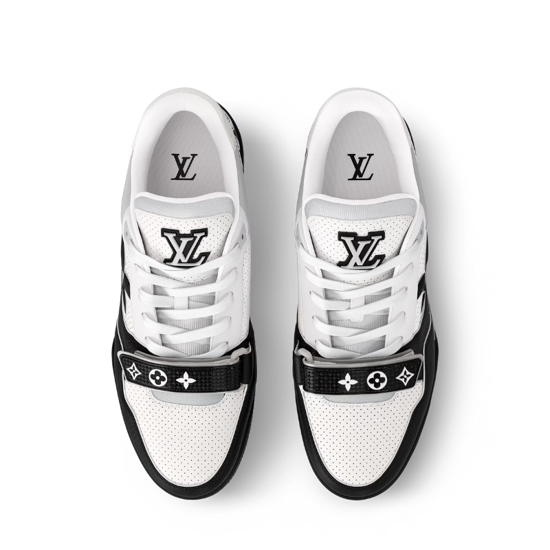 本季标志性的LV Trainer运动鞋以光滑小牛皮重新演绎,并饰以精致的微孔设计。这款运动鞋的设计灵感源自复古篮球鞋,其精湛的鞋面工艺和多项标志性细节彰显了品牌特色,包括侧面的Monogram花卉图案和鞋跟处的不对称Louis Vuitton标志。