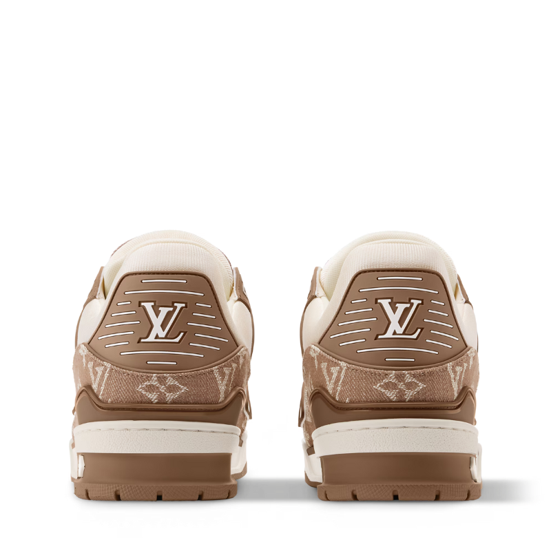 This season’s LV Trainer sneakers are reimagined in Monogram denim and grained calf leather, blending casual comfort with refined elegance. The upper draws inspiration from vintage basketball shoes, featuring meticulous construction and signature rubber accents. The two-tone rubber outsole is adorned with three Monogram floral motifs.