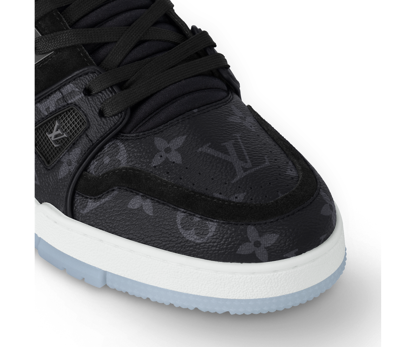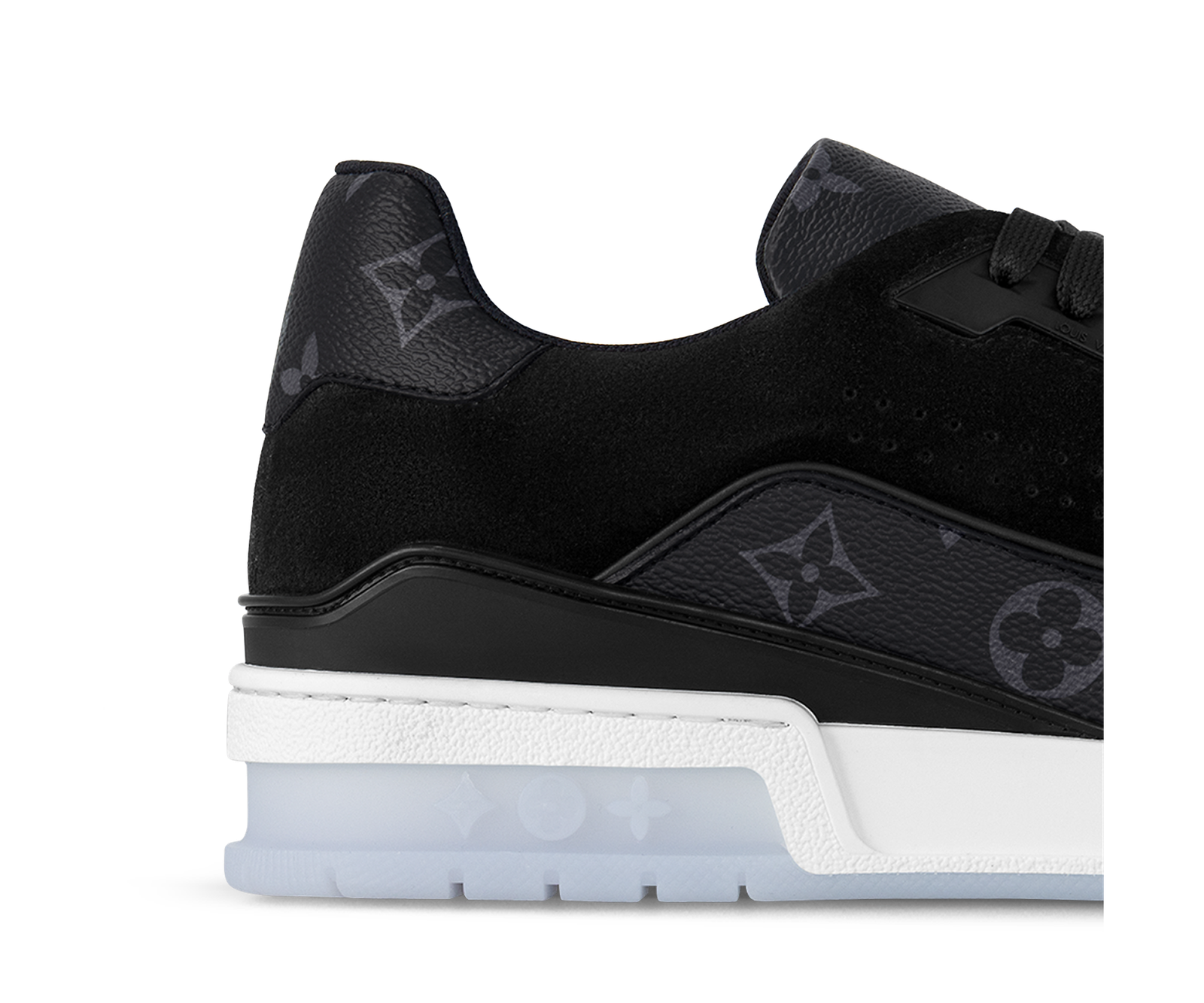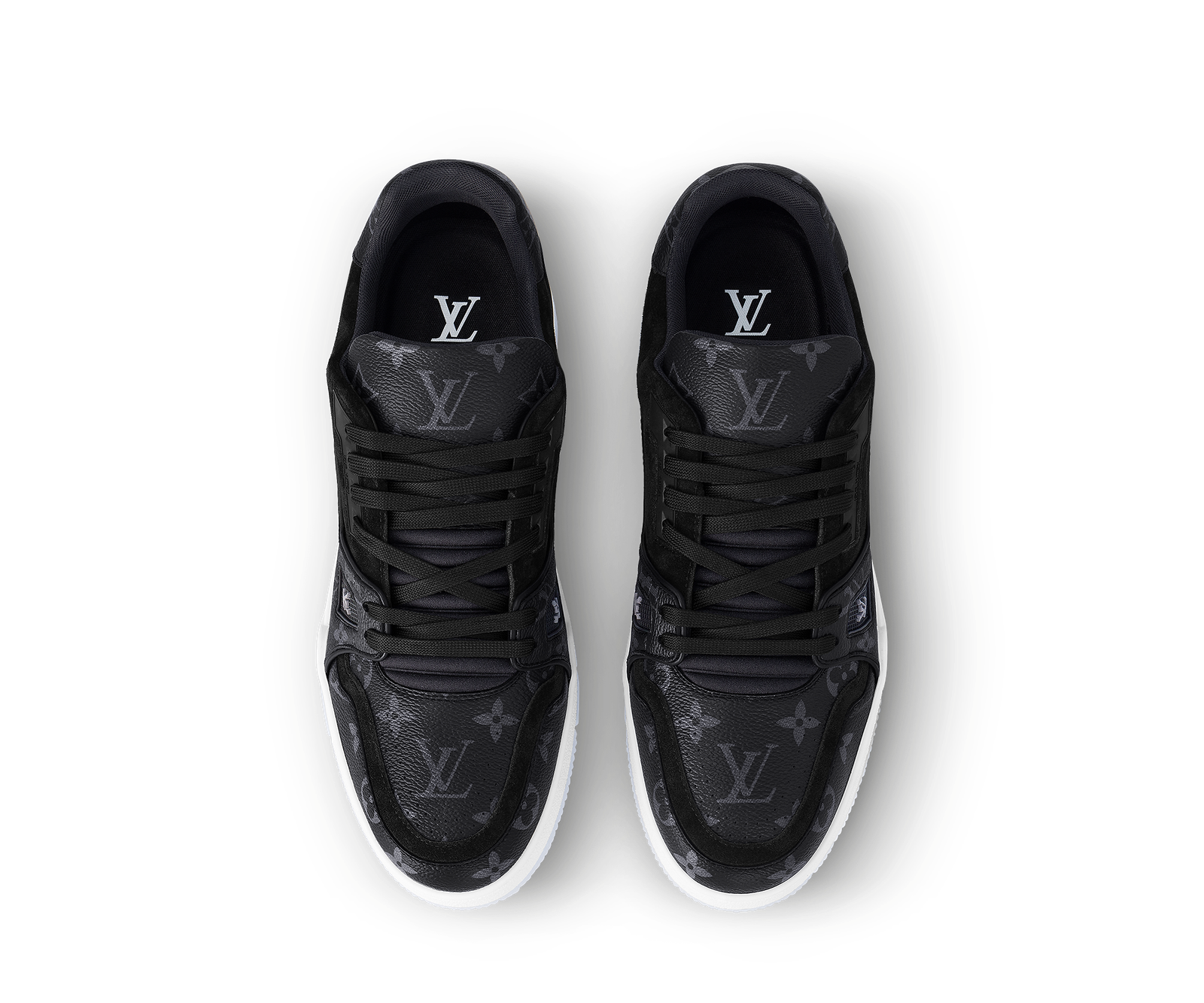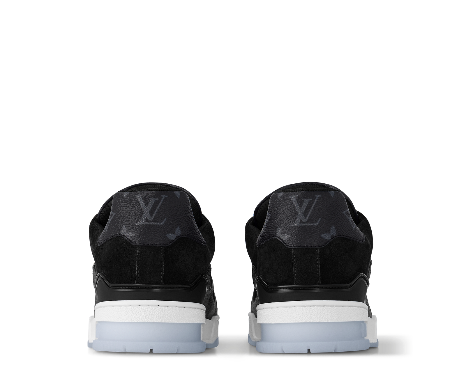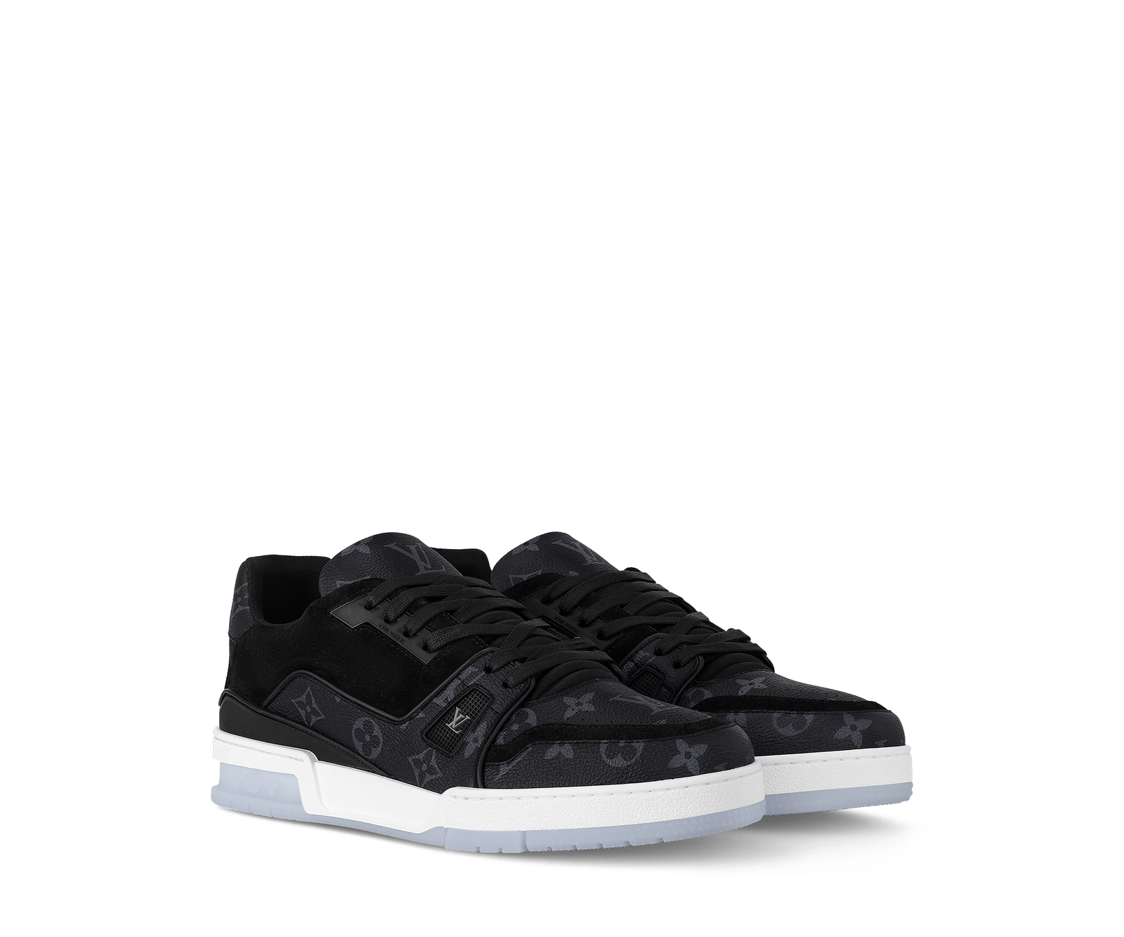 The LV Trainer sneakers designed by Louis Vuitton Artistic Director Virgil Abloh make a fresh appearance in Monogram Eclipse and Monogram Reverse canvas. This classic design draws inspiration from basketball shoes, featuring an intricately structured upper paired with a contrasting white rubber outsole adorned with Monogram floral motifs.