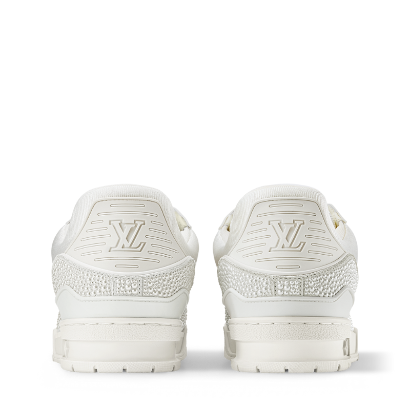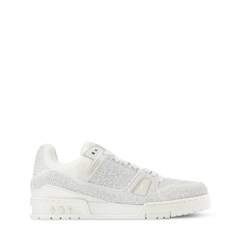 This special edition LV Trainer sneaker is entirely encrusted with Swarovski™ pearls, creating a pure, sparkling visual effect. Originally designed by Virgil Abloh, this classic silhouette draws inspiration from vintage basketball shoes. Its meticulously crafted upper features signature rubber elements, including LV monogram detailing on the tongue and heel, alongside Vuitton lettering on the side.