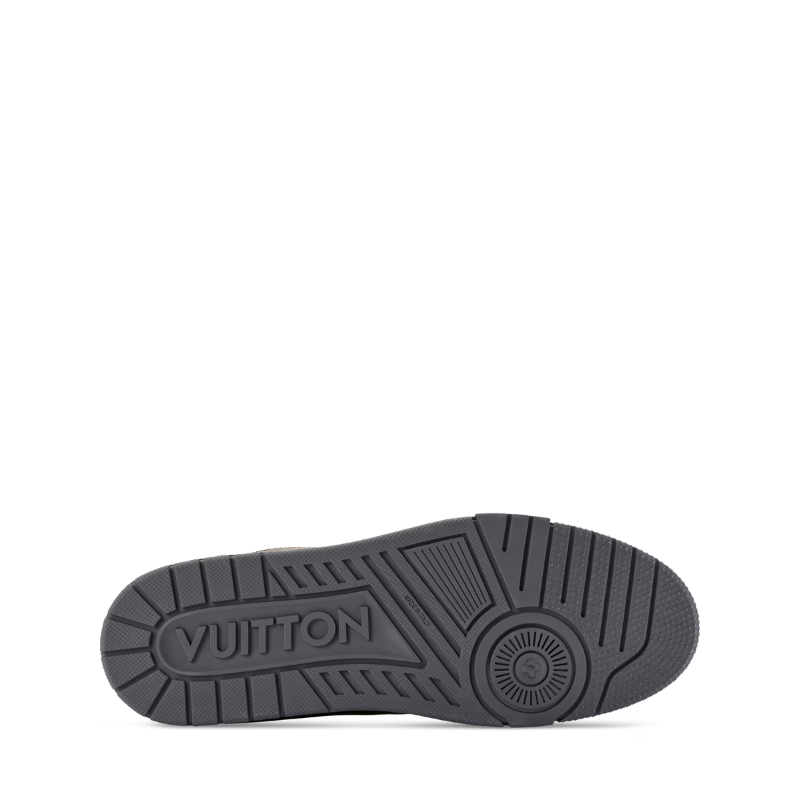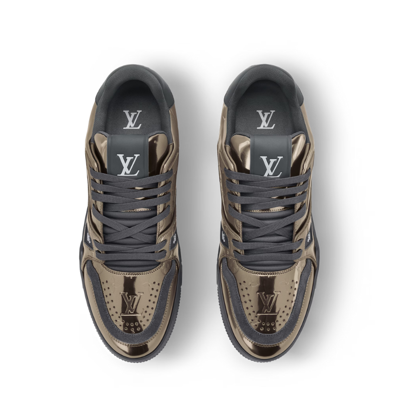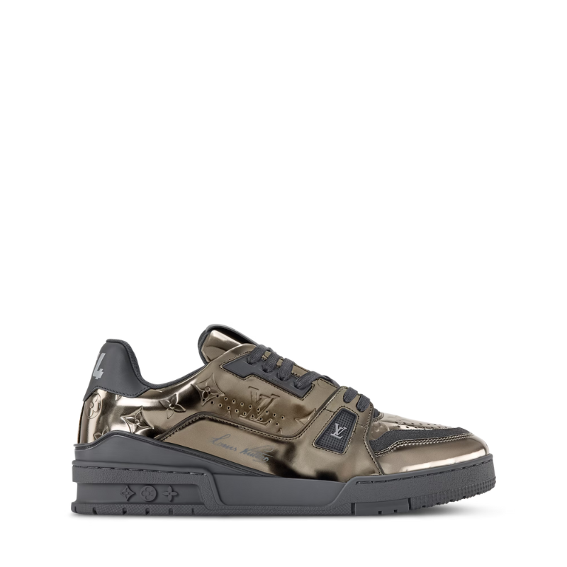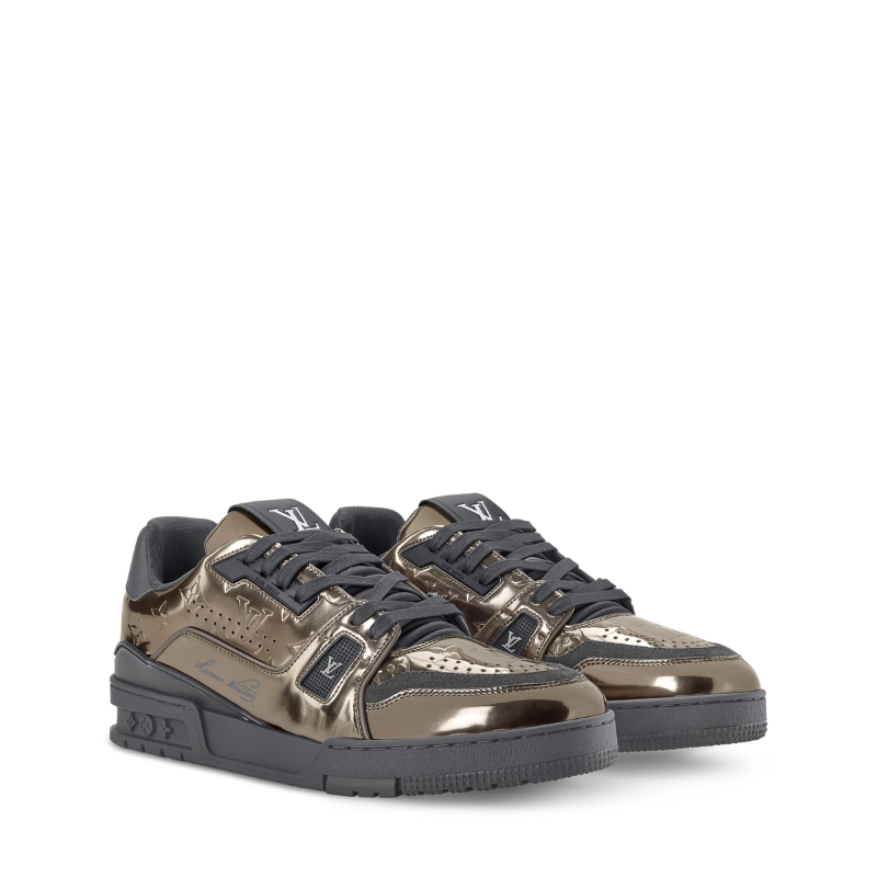 The LV Trainer sneaker is revisited in Monogram-embossed synthetic leather with a metallic mirror finish that coordinates with the leather goods collection. This iconic model is carefully assembled from more than 80 separate pieces. It features an LV Initials signature on the side and #54 at the back, referring to 1854, when the House was founded.