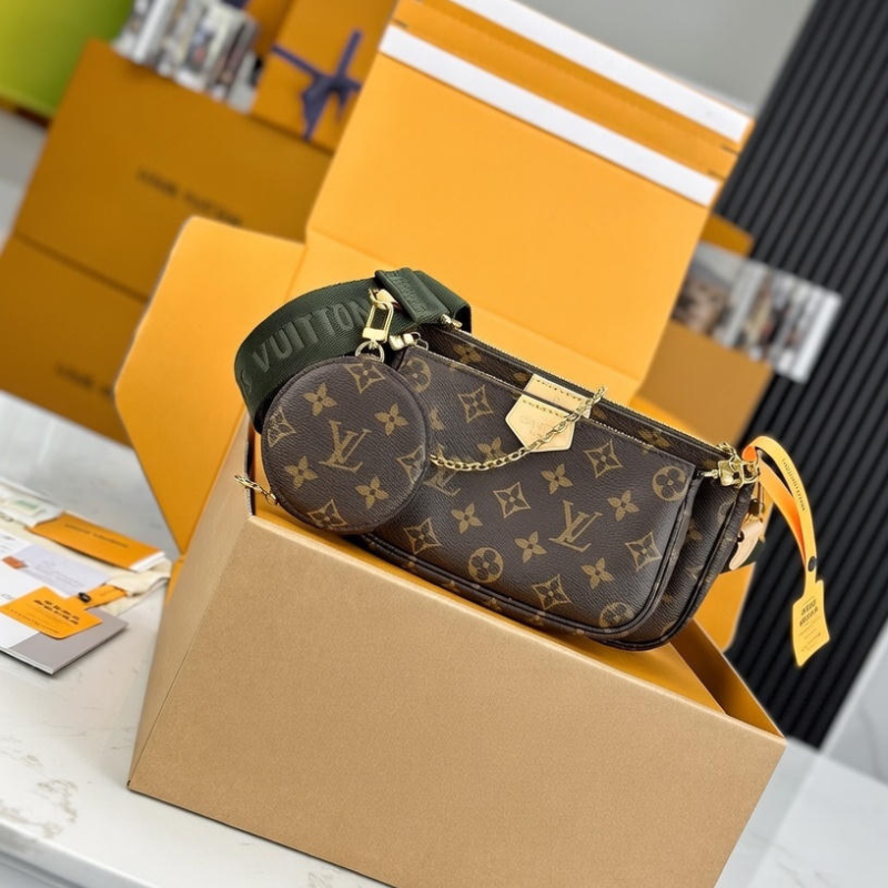 3-in-1 Design: Main bag (Pochette Accessoires) + Detachable mini pouch (Mini Pochette) + Detachable round coin purse (with chain) Shoulder Strap: Adjustable fabric strap (embroidered with Louis Vuitton, khaki green, supports crossbody carry, adjustable length approx. 94-120 cm) Chain: Detachable gold-tone chain (supports short chain crossbody or handheld carry)