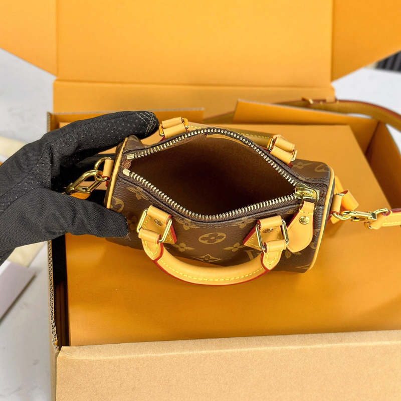 The Nano Speedy bag, redesigned in Monogram canvas, is the perfect miniature version of Louis Vuitton’s iconic Speedy bag—an ideal choice for carrying essentials. This exquisite design beautifully combines distressed natural cowhide leather with gold-tone metal hardware. In addition to dual handles, it features a removable adjustable shoulder strap for versatile carrying options.
