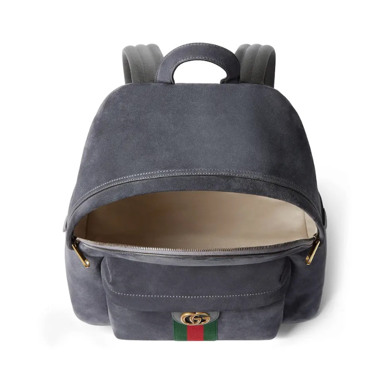 The Ophidia collection masterfully blends striped webbing with a gold-tone double G logo, introducing a new addition to the Fall/Winter 2025 line. This medium-sized backpack is crafted from lightweight, soft gray suede with a tonal cotton-linen blend lining.