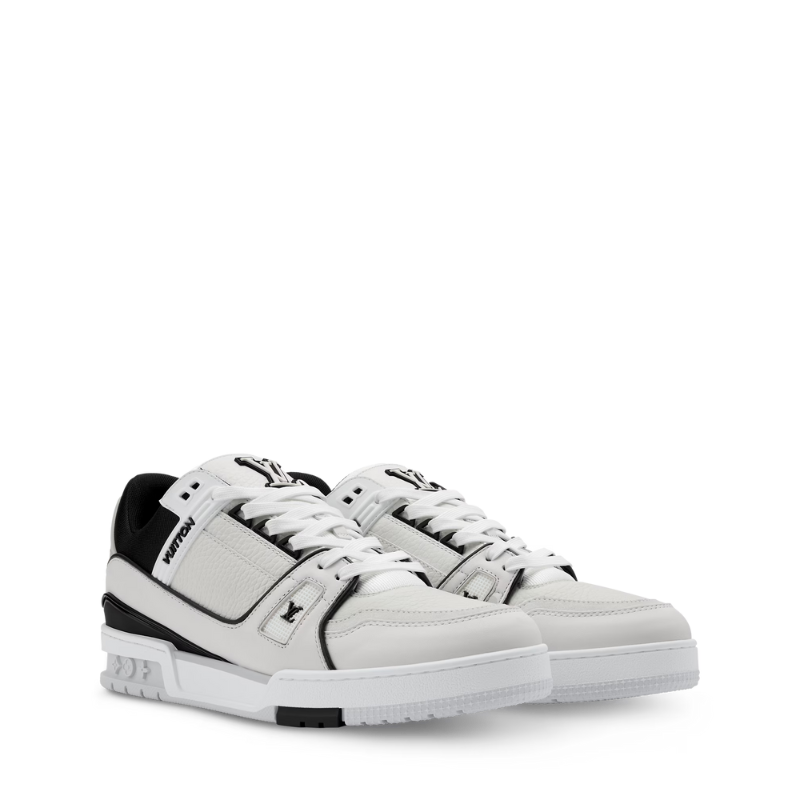 Dieser stilvolle zweifarbige LV Trainer Sneaker ist aus genarbtem Kalbsleder gefertigt. Seine dynamische Farbgebung ist eine Hommage an die Retro-Basketballschuhe, die Virgil Abloh zu diesem Design inspiriert haben. Das Obermaterial ist mit einem LV-Monogramm aus Gummi und Louis Vuitton-Signaturen verziert, während die Außensohle mit Monogramm-Blumenmotiven geschmückt ist.